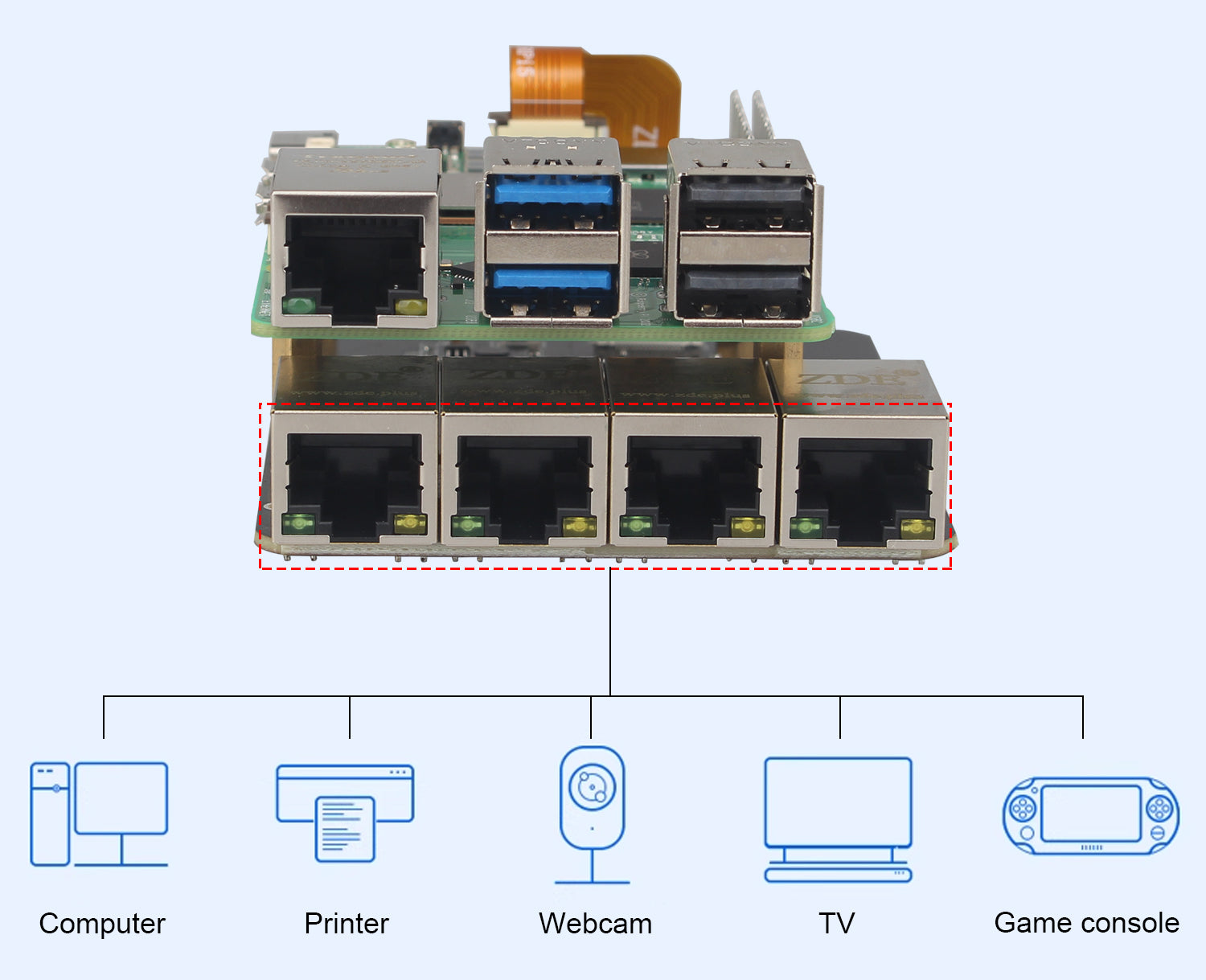 Use these 4 ports as LAN port and the network port that comes with the Raspberry Pi 5 as a WAN port, so that you can build your own router or switch with the Raspberry Pi 5. The adapter board can also be used to other multi-network port applications, such as Robot, Smart Home, VOIP, Industrial Equipment and more.